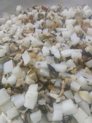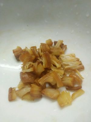 把腌好的白萝卜洗一次,用锅烘炒煸干(不放油),接着放冬姑丁、瑶柱,煸香后起锅