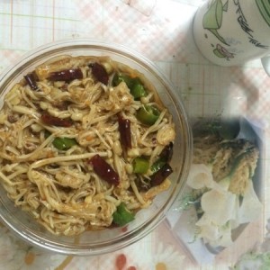 把金针菇从凉开水中捞起凉干放入容器,把炒好的料倒入。放点糖盐麻油。