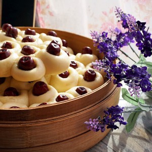 蒸笼中铺上防粘垫,将做好的红枣馒头摆放在蒸笼中。