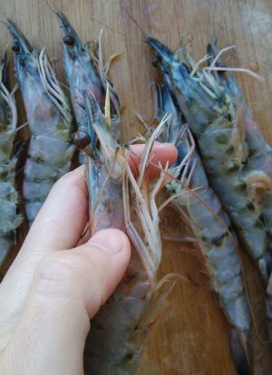 虾洗净,从尾部勾出沙线,剪掉长须