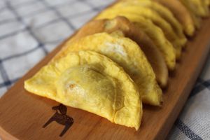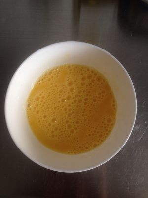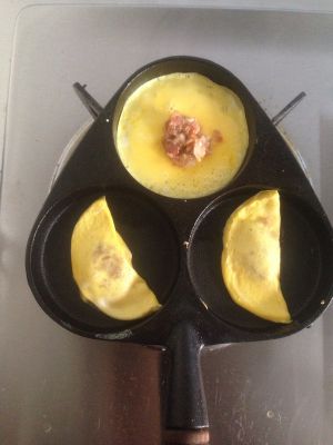 勺少许蛋液放入平底锅,摇匀(不宜太多,厚度两毫米左右合适),蛋液开始凝固时加入适量肉馅,然后迅速对折!(我用勺子和筷子辅助对折)压紧边角