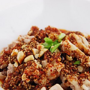把调好的料汁淋在切好的鸡肉上,洒上少许花生碎,点缀少许香葱,就制作完毕啦。