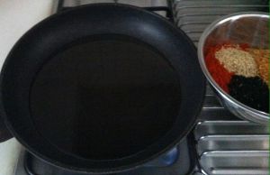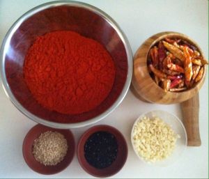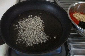 准备食材:普通辣椒粉.云南小米辣.白芝麻.黑芝麻.蒜蓉备用。