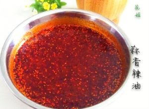 等油温上来,倒入蒜蓉,等蒜蓉变微黄关火。把油浇在辣椒碗里,先浇一半油搅拌均匀,再把剩下的一半油全都浇上就好。