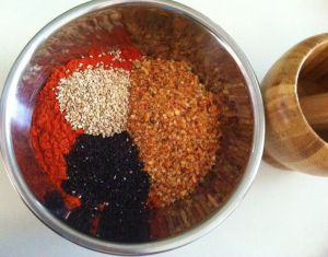 准备一个大一点的耐烫的不锈钢碗,把普通辣椒粉放入不锈钢碗里,云南小米辣捣碎和白芝麻.黑芝麻一起放入不锈钢碗里。