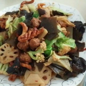 土豆切片焯水、莲藕切片焯水、腐竹焯水备用。