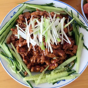 锅底留油,把调好的酱倒进去,再倒入葱姜水。酱汁开始冒泡泡的时候把炒好的猪肉条放进去。翻炒。
