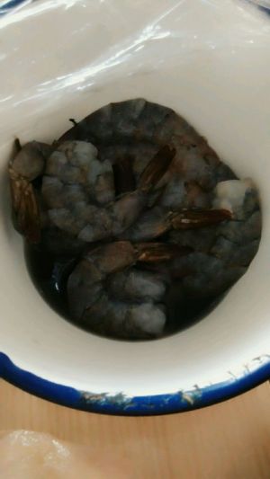 虾去头、壳,尾部皮留存。放入料酒、盐腌制。