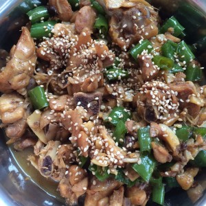 倒入鸡肉翻炒放入盐少许,生抽蚝油冰糖继续翻炒,倒入之前炖鸡的汤或热水,收汁后出锅撒上芝麻。