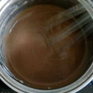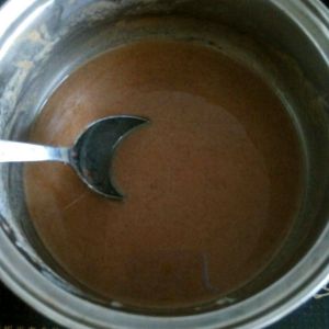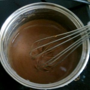 关电磁炉,再向牛奶豆沙液中加5g糯米粉,用打蛋器搅拌均匀