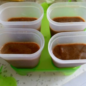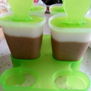 倒入DIY冰棒的模具中,为了保证分量相同,可以每个模具先放一半,再把剩下的豆沙糊均匀分到每个模具内,份量刚好够四个小棒冰