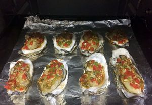 拌好的辅料均匀的摆在牡蛎上,放入烤盘