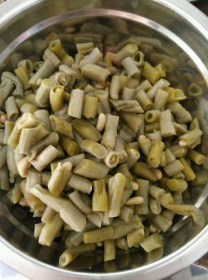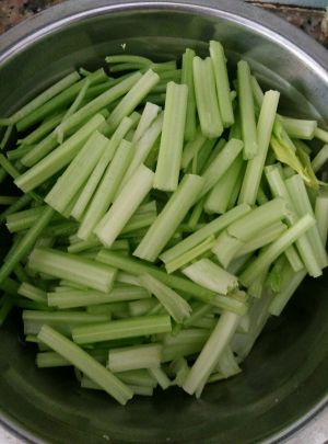 热锅凉油放姜蒜辣椒爆炒出香味,放肥肠爆炒,加少量米酒去骚味,加酱油!接着放入酸豆粒香芹番炒一下就OK了!