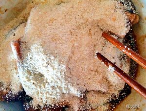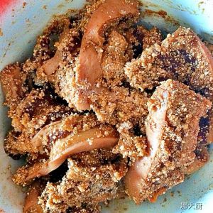 稍腌半小时后夹出葱姜,把炒好的米粉倒入一同搅拌继续腌制半小时。