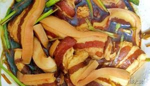五花肉切片,加适量盐、糖、胡椒粉、料酒、生抽、老抽(调色)、蚝油、葱姜腌制。