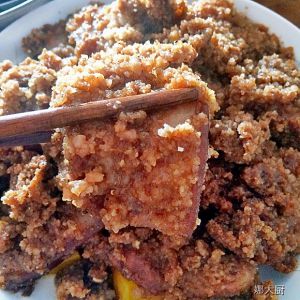 今天腌肉的经验是水分要足,否则蒸出来太干。可以多加些酒,也可适当加水,多腌一会让米粉吸足水分,这样蒸出来肉烂米糯,传说中的入口即化(这个词被美食节目玩坏了哈哈)