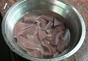 猪肝切薄片,放进大碗,加入没过猪肝的水,滴入几滴白醋,浸泡15分钟后用流动水冲洗至没有血沫为止;