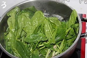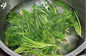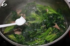 重新烧开一锅水,水开后,放进菠菜、猪肝、姜丝,淋少许油;