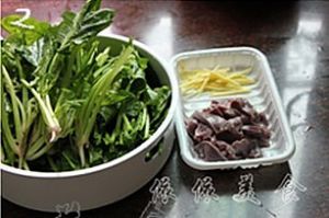 菠菜清洗干净,切成两段;生姜刮皮后切成姜丝;