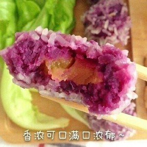 取适量的紫薯泥搓球压扁放一块芒果揉圆