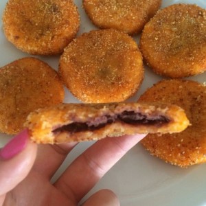 南瓜球压扁裹入豆沙馅。
