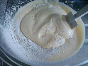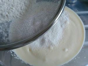 将粉类过筛进蛋液里,分三次过筛