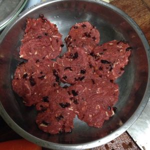拌匀后 把牛肉一小坨一小坨的搓圆 压扁 尽量薄一点 煎的时候比较容易熟