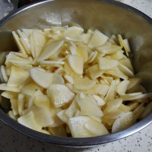 腌制后,汤倒出。冰糖弄碎,剩余的半勺盐和所有材料一起放入,拌匀。颜色不要太深。
