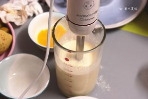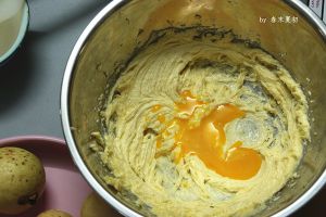 (派皮)黄油切小块,软化后加入糖粉,电动打蛋器打蓬松,加入打散的蛋黄继续搅打均匀。