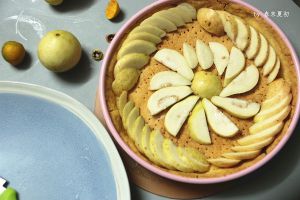 烤好取出,派面放上切好的番石榴片,倒入馅液,再撒点椰蓉。
