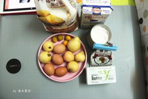 材料准备,蛋糕粉、淡奶油、鸡蛋、小柠檬、糖粉、椰蓉、黄油。