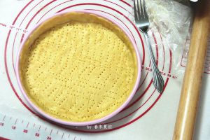 预热烤箱,180度,上下火。把派皮一面的保鲜膜撕掉,另外一面的保鲜膜保留,戴一次性手套把保鲜膜和派皮轻移到盘里,保鲜膜那面朝上,用手把派皮整形好,用叉子叉些小孔。