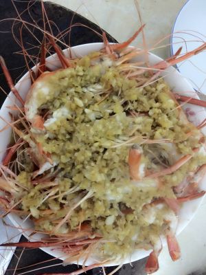 虾开好边,放拌匀的姜蒜一层层放在虾上,要一层一层放,这样味道才能渗入均匀。