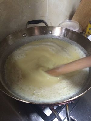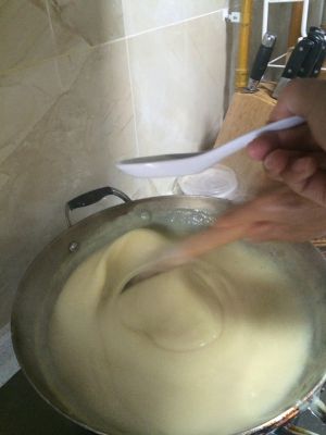 不断加白色沉淀物的调均匀的汁,不断按同一个方向搅拌,记住只能按一个方向搅拌