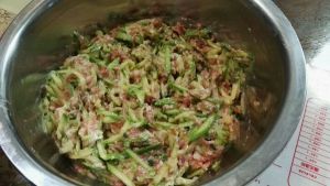 把西葫芦瓜拌入肉馅,馅料就做好了。