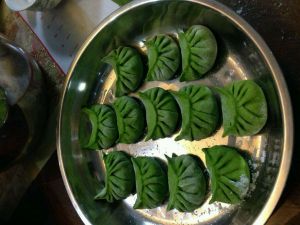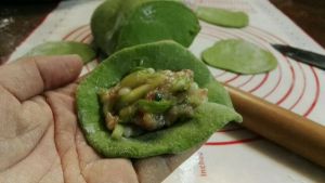 用擀面杖擀成薄面皮,中间稍稍厚些,然后放入馅料。