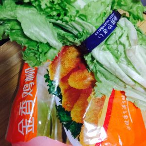 准备主要材料:家里常备的炸鸡柳等炸鸡类食品,生菜叶。然后,把热米饭准备好放到碗底→生菜叶切碎放好→炸好的鸡柳切碎放好。