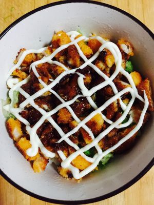 最后,将准备好的酱汁淋到炸鸡上适量,再准备喜欢的沙拉酱画上喜欢的图案。香喷喷的炸鸡饭就开吃了~