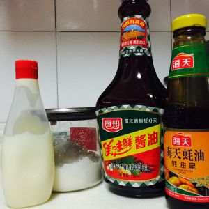 制作酱汁:一勺酱油一勺蚝油少许白糖,放到锅中熬制。