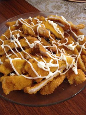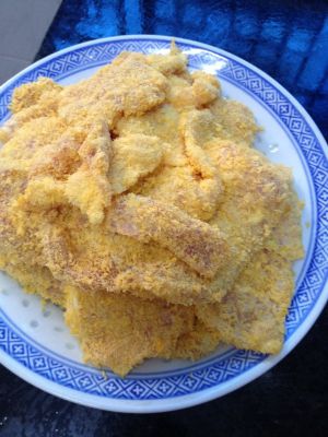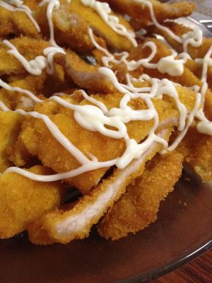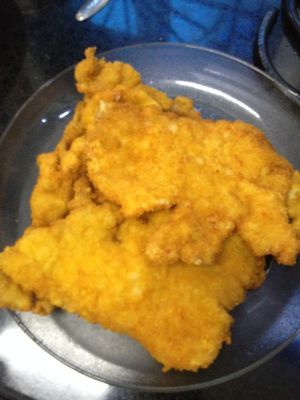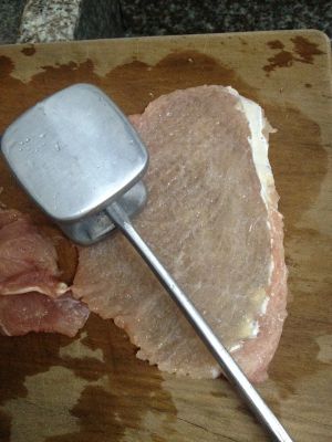 盐、味精鸡精、少许姜末,记得少许哦,把肉腌半小时,加香炸粉和少许少许水拌匀,然后再裹上黄面包糠