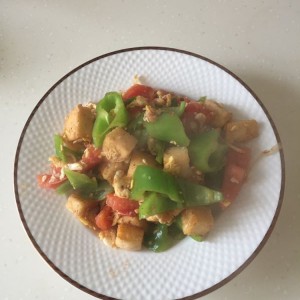 放入青椒,翻炒,最后放胡椒粉跟盐调味