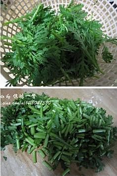 茼蒿洗净,叶子尖掐下来单独放,梗(留少许叶子)切成小段