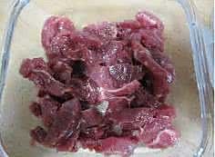 切好的牛肉丝洗净,事先用葡萄酒、生抽、糖、鸡汁、生粉、小苏打少许上好浆,用手抓匀。开炒前10分钟加入少许色拉油,再次用手抓匀。