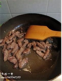 平底锅加热,倒入油,油稍多,放腌制好的牛肉丝翻炒,牛肉变色,立即取出