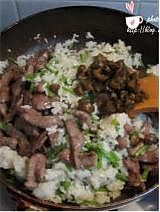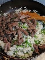 把事先炒好的牛肉放入米饭中,炒均匀