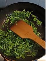 把米饭和茼蒿炒均匀,火再小一些,不停地炒