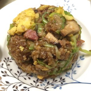 米饭下锅翻炒,加入老抽、蒸鱼豉油翻炒拌匀