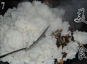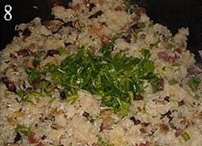 加入煮好的糯米饭(如果饭是熟的就直接把饭与锅里的配料拌匀就行,但如果象我这样是一锅夹生饭,那就要边炒边洒进泡过冬菇虾米(或开水),待米饭与配料完全拌匀以后,围着锅边加入2~3汤匙水,然后盖上锅盖,小火焖至水干, 然后,把饭翻面,继续加入2~汤匙水,盖上锅盖,小火焖至水干,检查一下,米饭已经熟透,就改大火,把拌匀的糯米饭炒至干身;