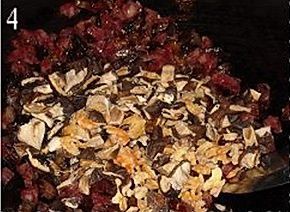 加入虾米和冬菇丁,继续翻炒2分钟,炒的过程可以洒点泡过冬菇虾米的水;