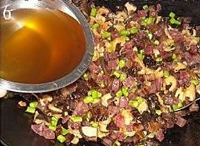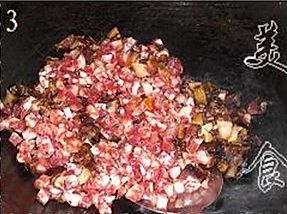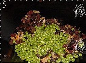 烧热锅,放进切丁的腊肉、腊肠,翻炒1分钟;